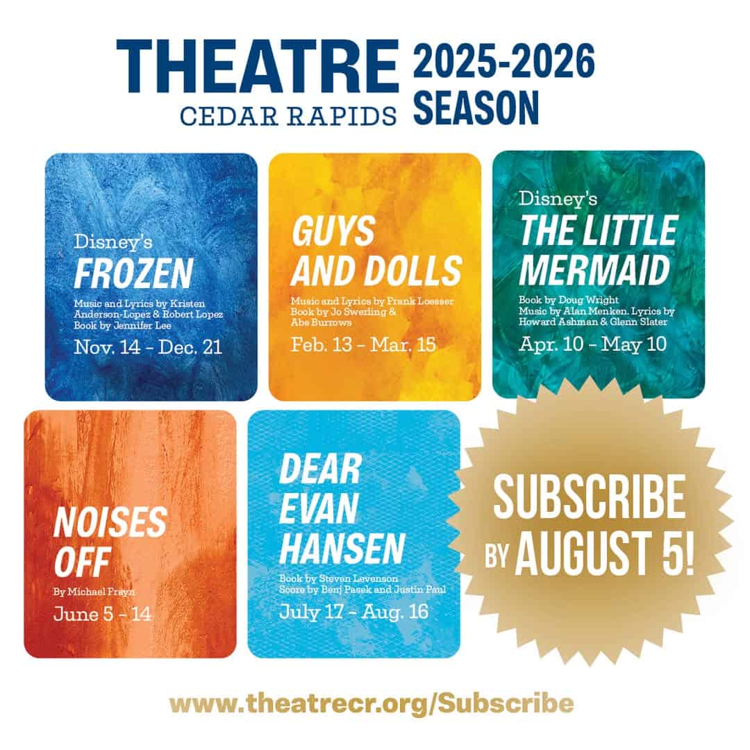 Thursday, March 20, 2025, Theatre Cedar Rapids announced its 2026-2026 season offerings. This five-show all-auditorium season accompanies an exciting renovation to the almost 100-year-old Iowa Theatre Building. Learn more, including ways to support the campaign.